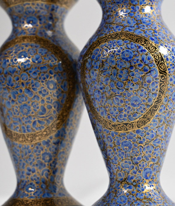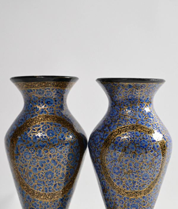 This pair of handcrafted vases showcases the elegant Shirk Posh design, celebrated for its intricate floral detailing in brilliant shades of blue and gold. Each motif is delicately hand-painted by skilled Kashmiri artisans, turning the surface into a canvas of fine craftsmanship.